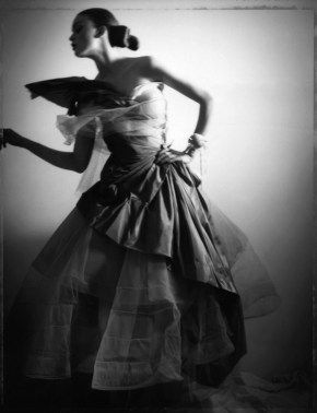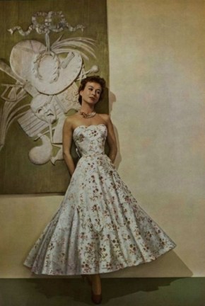 theniftyfifties: Model wearing a strapless gown by Jean Desses, 1954
